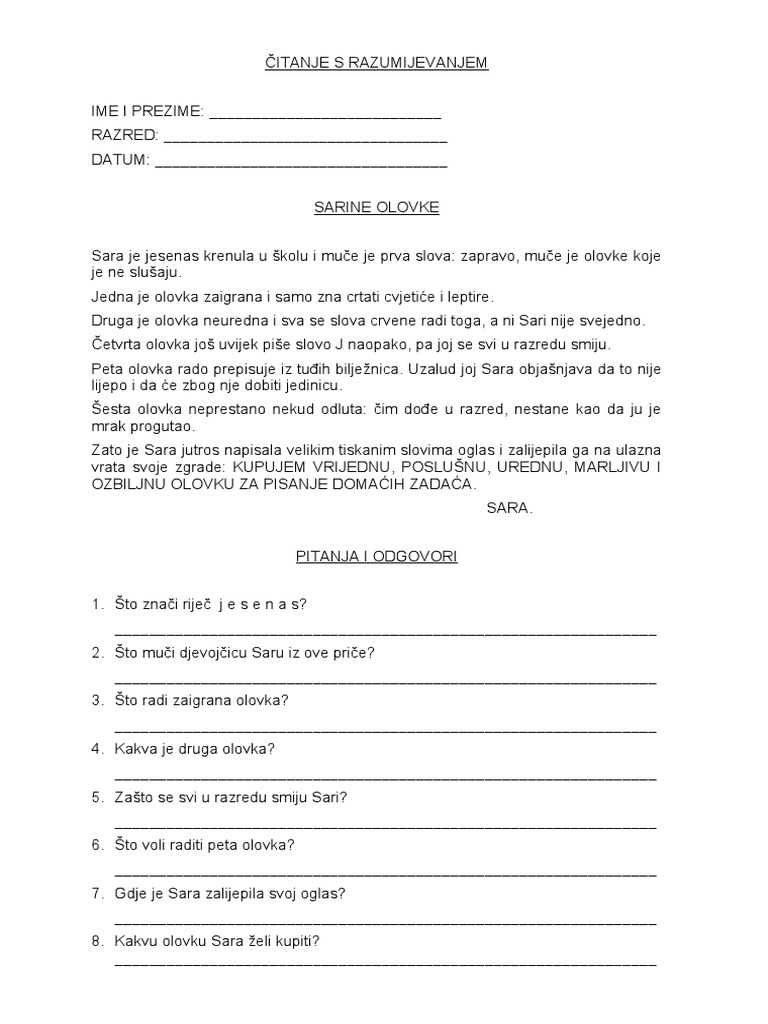 Razumijevanje Procitanog Teksta Listici Za Vjezbu