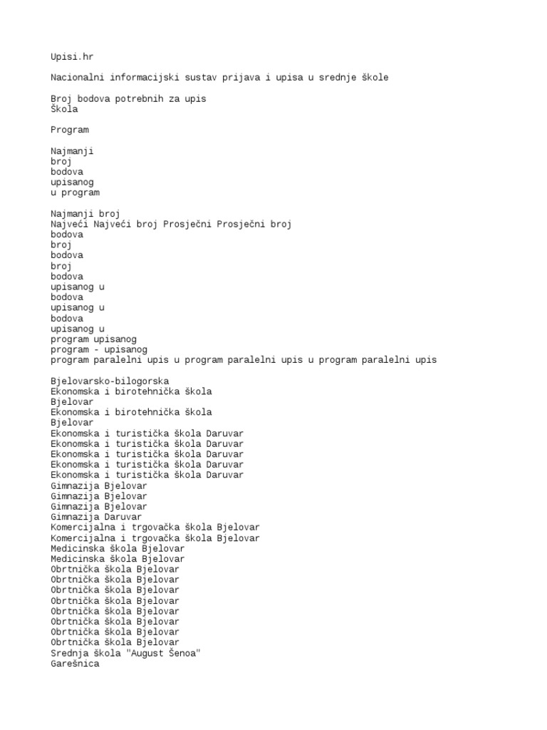 316828467 Broj Bodova Potrebnih Za Upis U Ss 2015 Txt