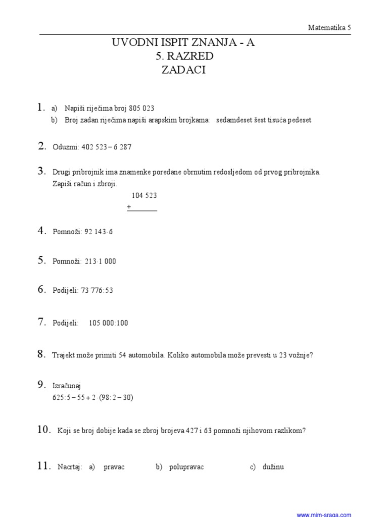 2 Uvodni Ispit Znanja A 6 Razred Zadaci 1 8 Mim Sraga