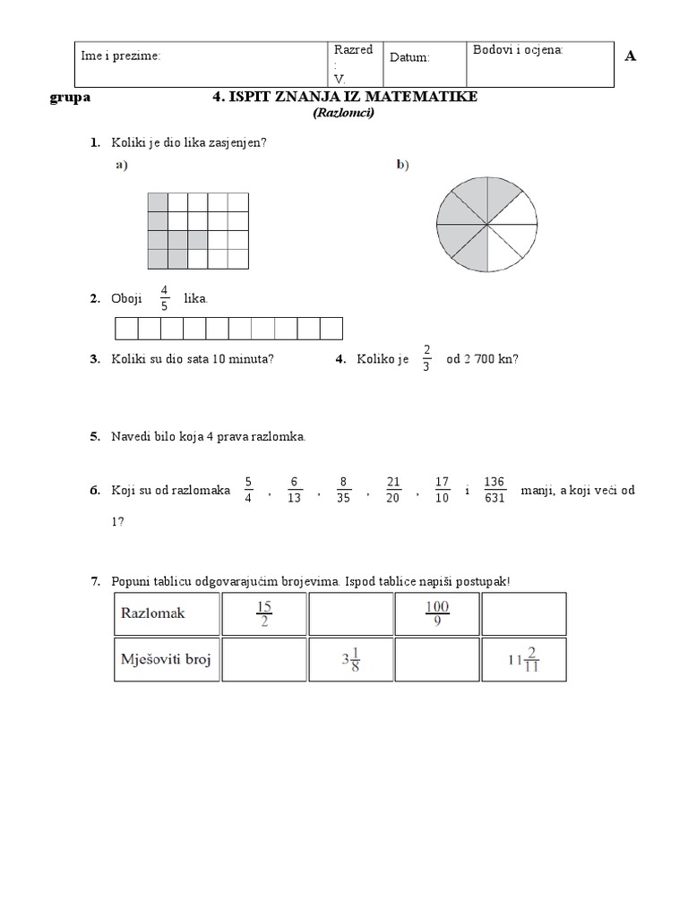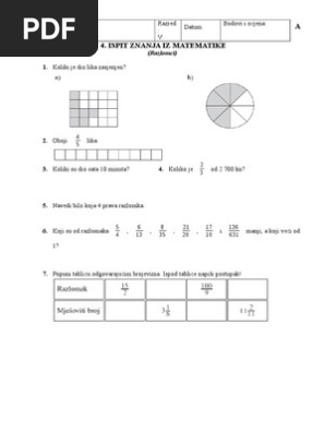 Ispit Znanja 4 Razlomci Peti Razred A