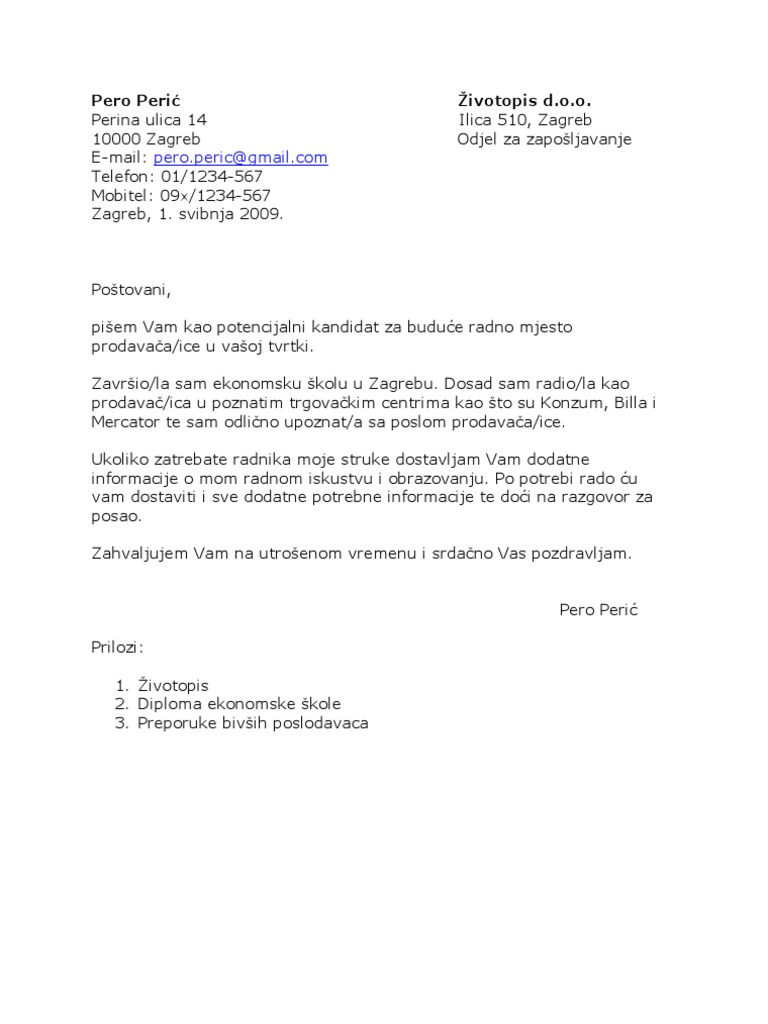 Molba Za Posao Primjer