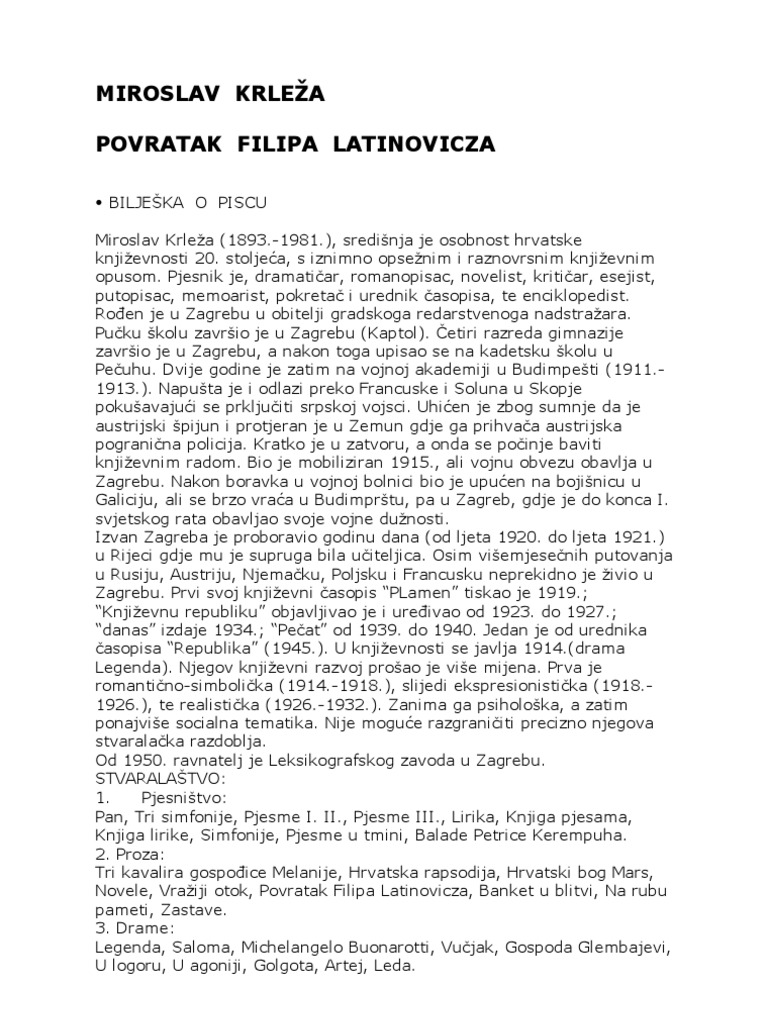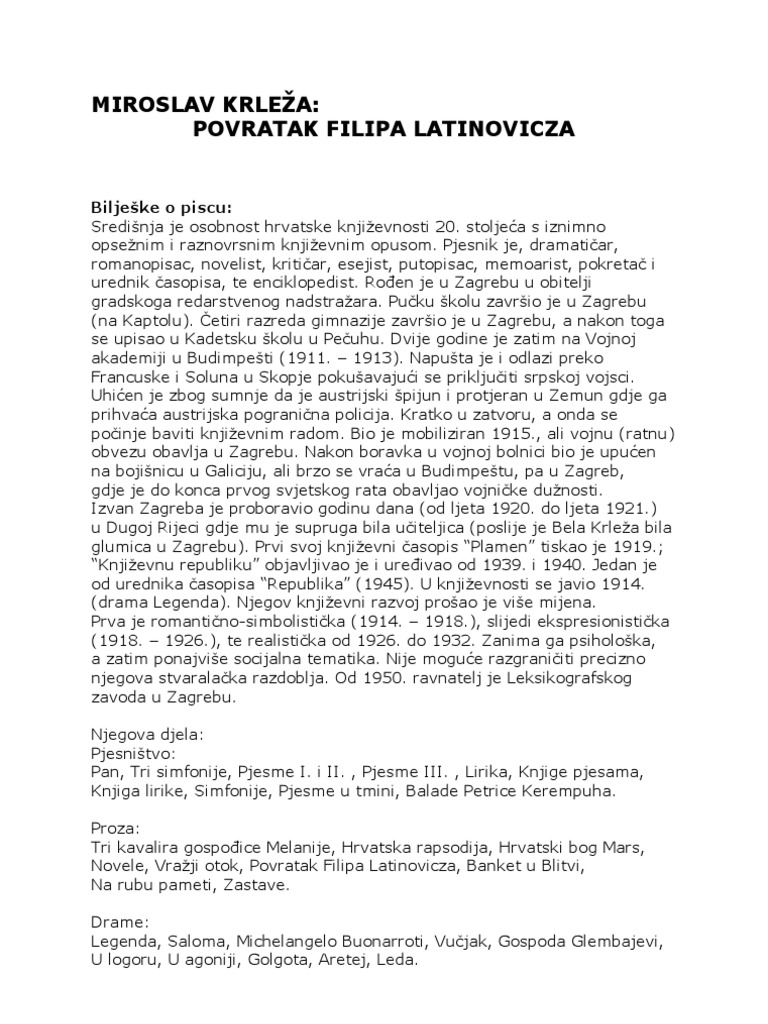 Pisao je sve od poezije i drame do novela i romana te brojne putopise polemike i eseje. Povratak filipa latinovicza miroslav krleža književni rod. Smjernice za pisanje školskoga eseja predstavite poetike romana bijeg i povratak filipa latinovića. Miroslav krlea hrvatski je pisac s poetka 20.
