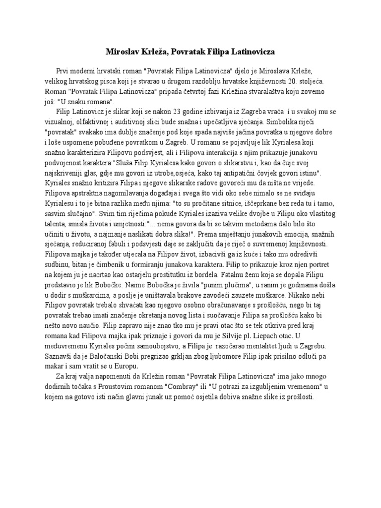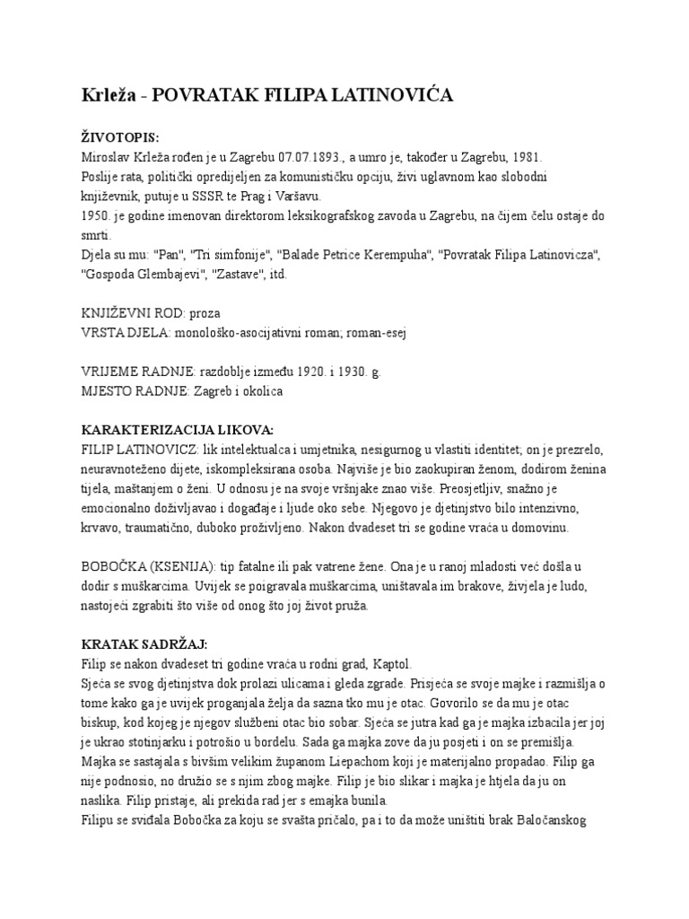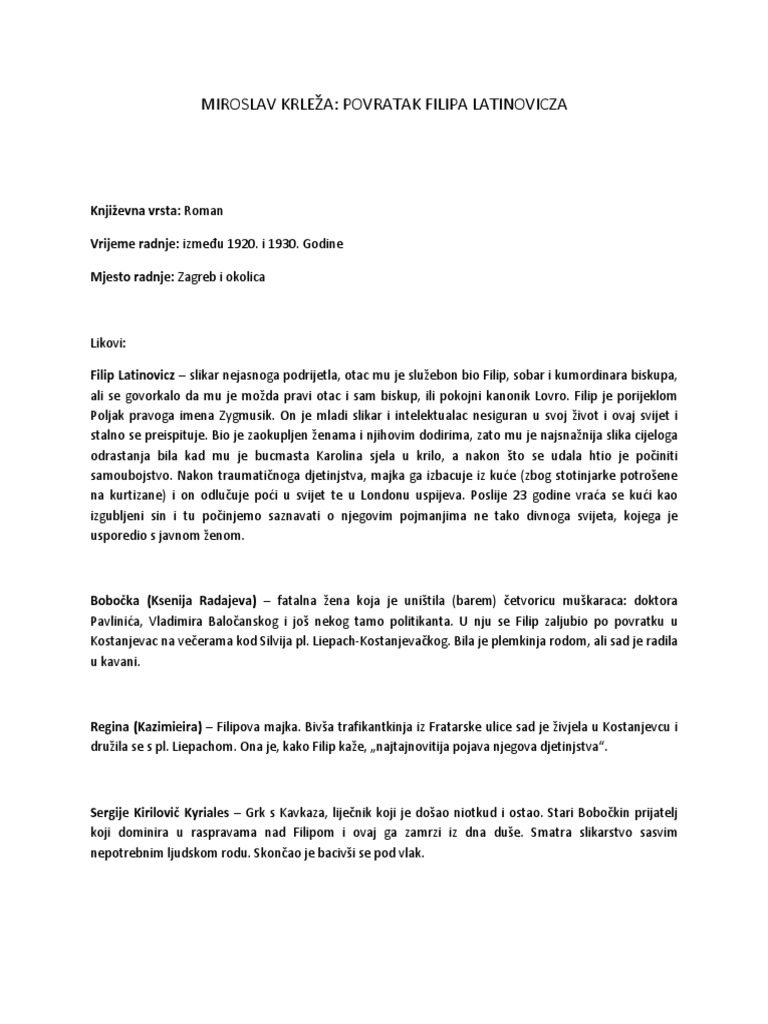 Sve smjernice morate uvrstiti u svoj školski esej. Djelo povratak filipa latinovicza prvi je hrvatski moderni roman svestranog hrvatskog književnika miroslava krleže a napisan je u kratkom razdoblju od 26. Djelo čine izvanredne no iznimno teške komponente riječi koje krleža koristi bez nekakvog smisla a julije benešić je njegov jezik opisao kao begovićijanski kuchelkroatiš izrazi. Zagreb i okolina kratak sadržaj filip se nakon dvadeset.