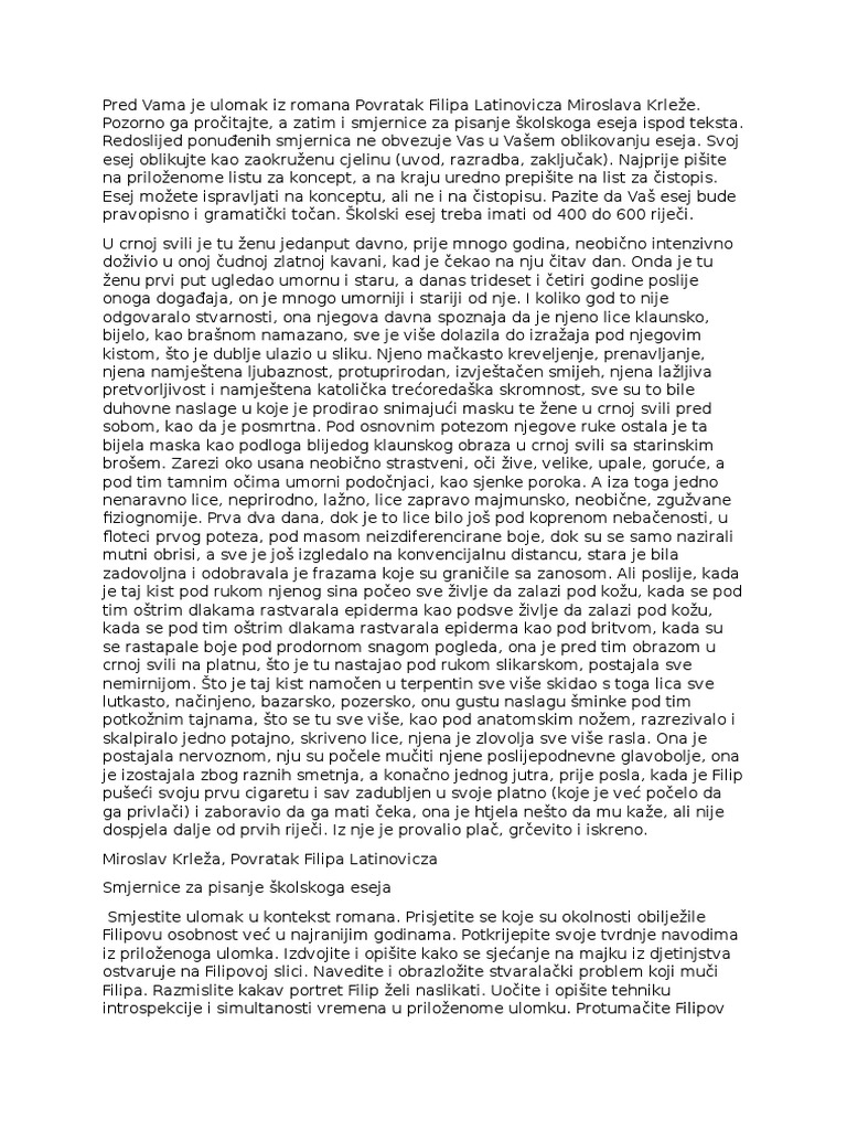 Najbolji esej na maturi 2013. Mutno filipovo podrijetlo psihološki kompleks u odnosu na oca filipov sukob s majkom. M krleža povratak filipa latinovicza vrsta romana moderni roman toka svijesti monološko asocijativni roman roman esej u liku filipa pokrenuto je nekoliko slojeva svijesti. Stoljeda koji se istie svojim raznovrsnim opusom.