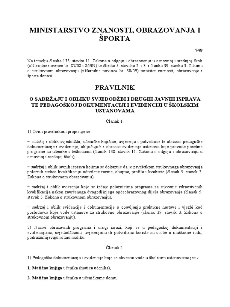 Pravilnik O Sadrzaju I Obliku Svjedodzbi I Drugih Javnih Isprava