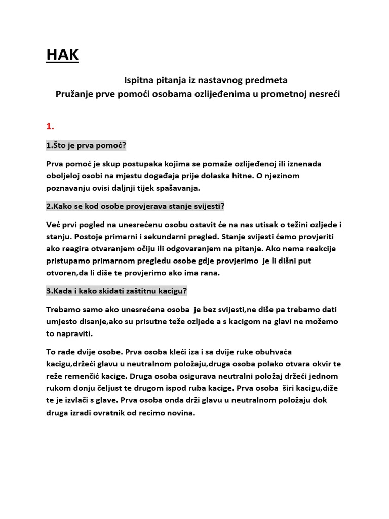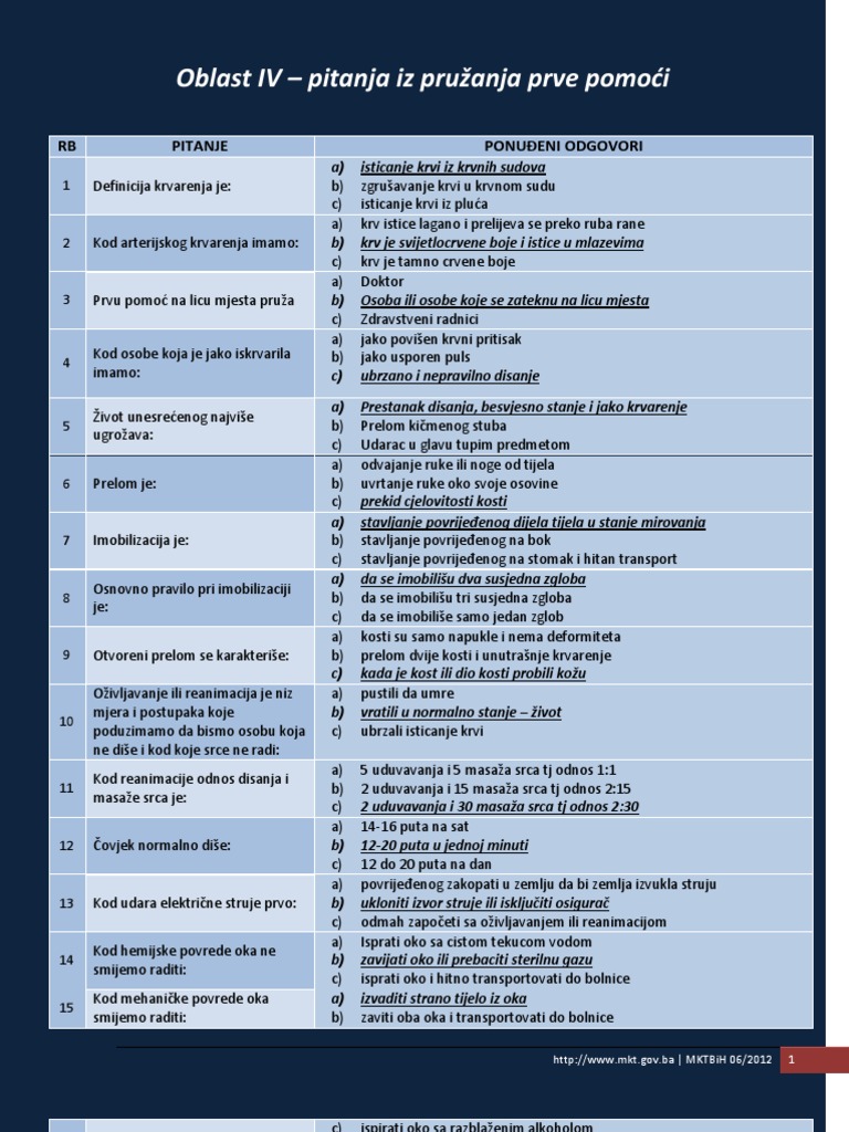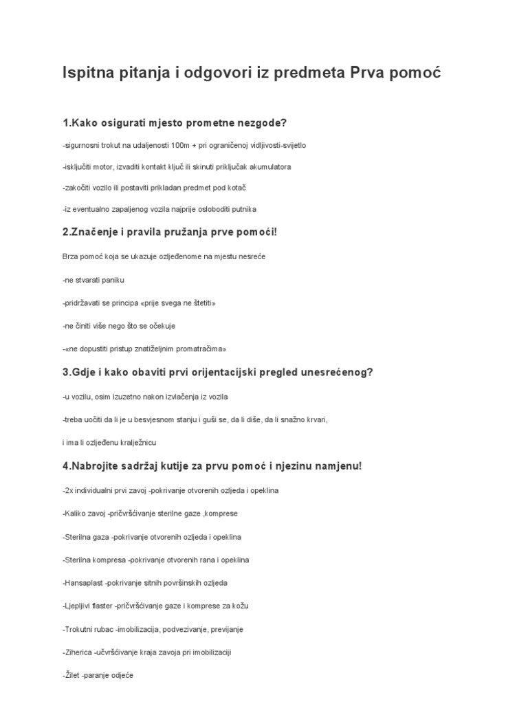 Ispitna Pitanja I Odgovori Iz Predmeta Prva Pomoc