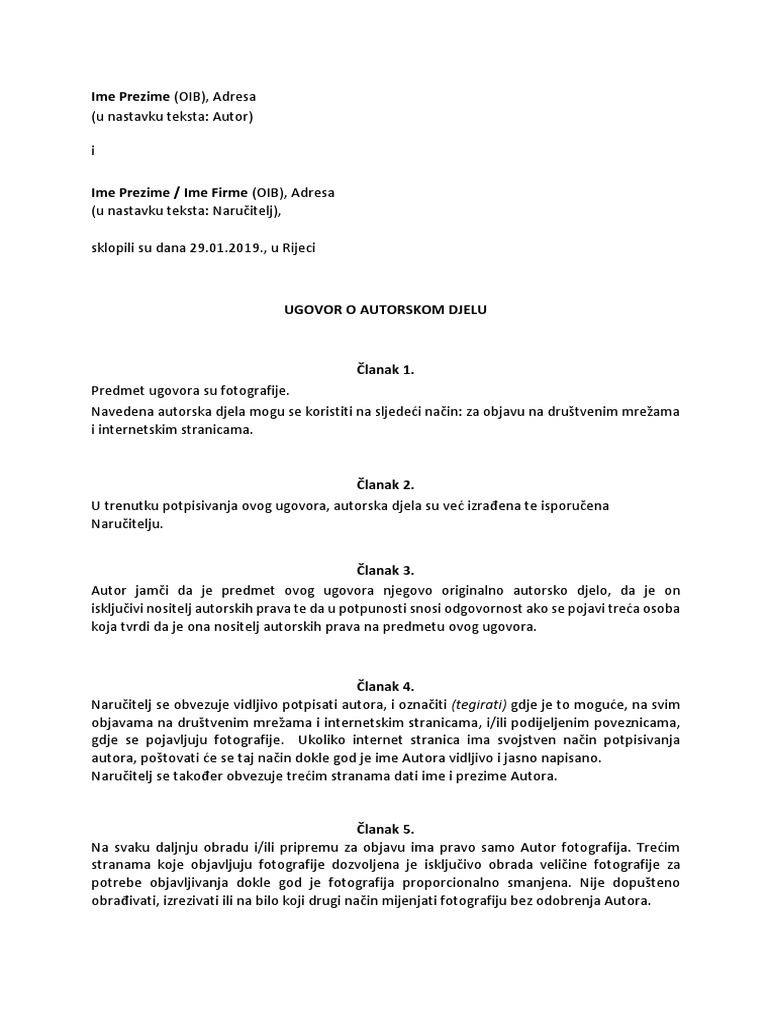 Primjer Ugovora O Autorskom Djelu Za Fotografije