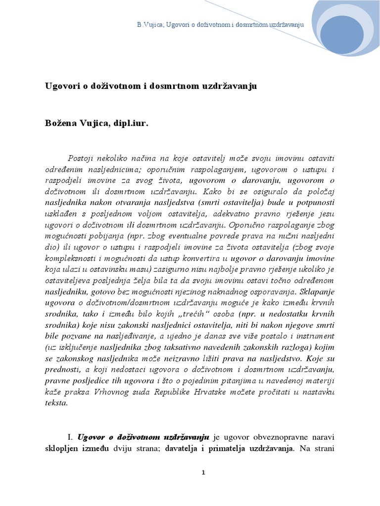 Ugovori O Dozivotnom I Dosmrtnom Uzdrzavanju Bozena Vujica