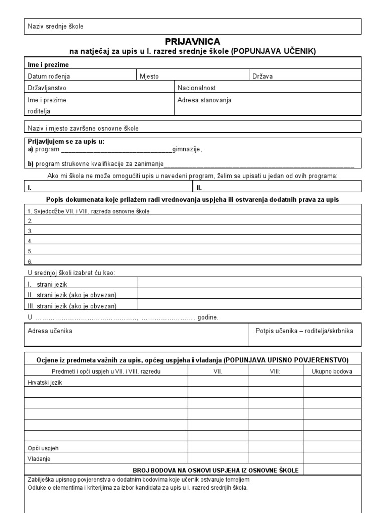 Prijavnica Na Natjecaj Za Upis U Srednju Skolu Pdf