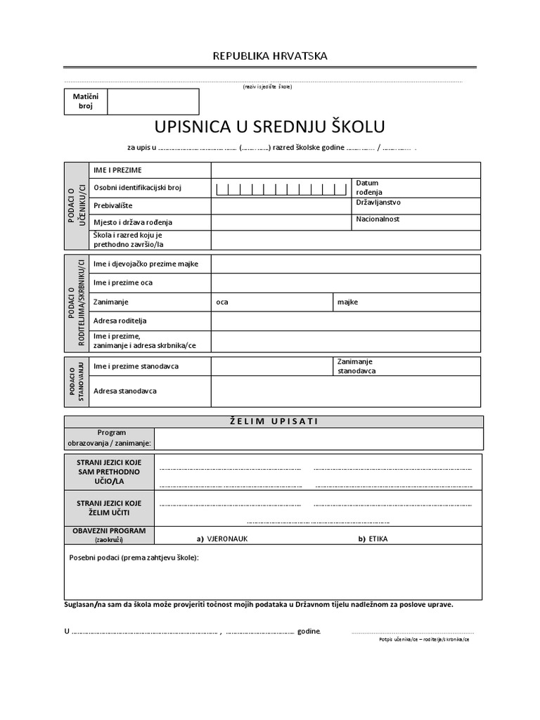 Prijavnica Na Natjecaj Za Upis U Srednju Skolu Pdf