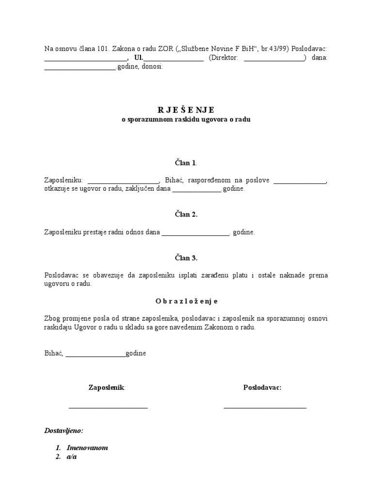 Sporazumni Prestanak Radnog Odnosa Besplatni Obrasci