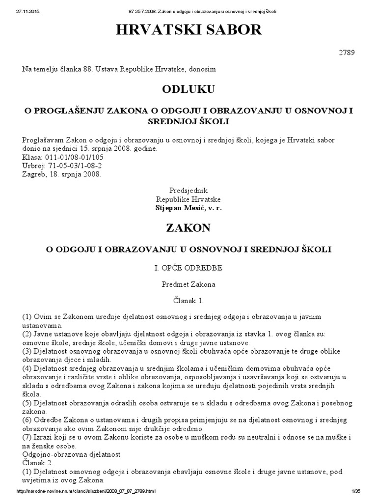 1 Zakon O Odgoju I Obrazovanju U Osnovnoj I Srednjoj Skoli 87 08